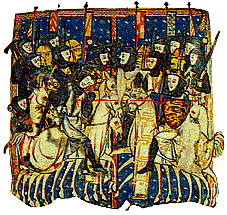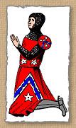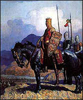 Guerreiro das cruzadas, na idade média. Note a simbologia usada no seu traje. Foi com a ajuda de cruzados do norte da Europa que D. Afonso Henrique, Rei de Portugal, tomou Lisboa aos Mouros em 1147. |